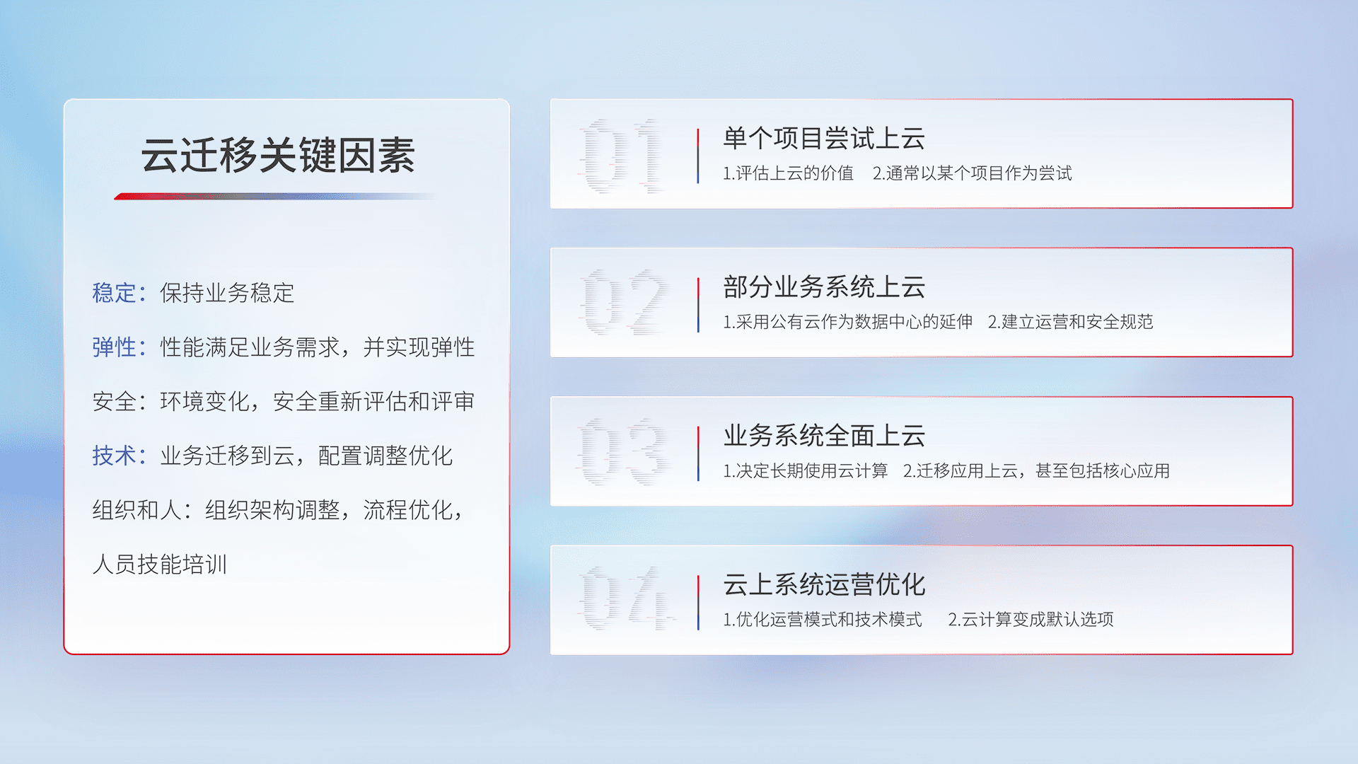 结合实际业务,,从规划设计、、云平台选型、、、、云原生改造、、、数据迁移、、集成交付,,,,迁移全过程为客户识别最佳上云路径,,做好风险识别管理,,,设计网络架构、、、身份权限、、、、安全审计合规、、操作审计、、日志审计、、、、监控告警策略、、多站点容灾设计等,,,,对云上基础设施进行整体规划,,提升IT治理水平,,以满足弹性、、、、高可用、、高性能的需求。。。