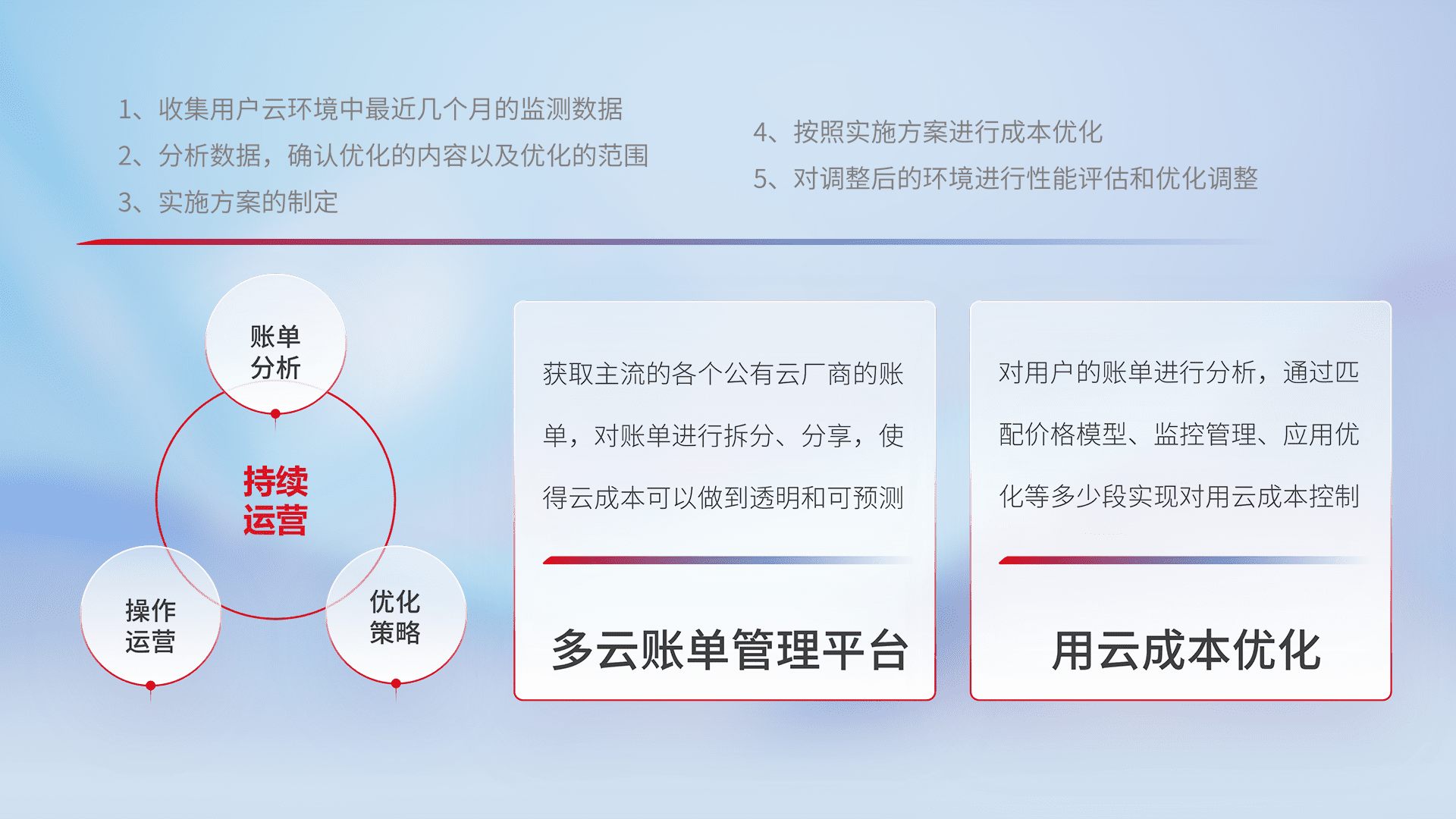 通过多云纳管,,,以统一的资源数据模型把客户的云资源进行抽象和封装,,,进而实现对多云资源的统一操作,,,保障云资源管理的可靠性、、、、稳定性与可用性。。。量身定制化运维内容,,,,配置、、、开发运维、、补丁管理、、、、备份、、监控、、认证和访问管理、、、、审计和日常巡检等,,,保障在用云过程中的可靠度,,,,稳定度以及高可用率。。。